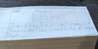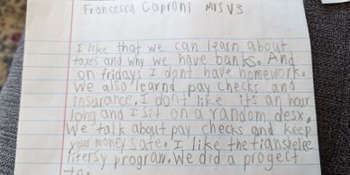 "I like that we can learn about taxes and why we have banks. And on Fridays, I dont have homework. We also learnt Paychecks and insurance. I dont like its an hour long and I sit on a random desk. We talk about paychecks and keep your money safe. I like the fianshelee litersy program. We did a progect to."