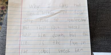 "Why I liked this class is because it took some time to understand but these past weeks have bin down, but this class is the fun in the school week"